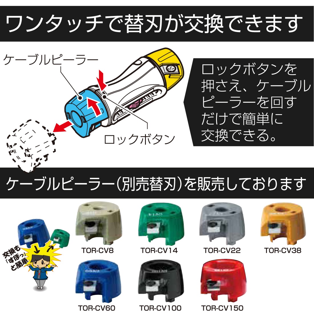 ●ロックボタンを押さえ、ケーブルピーラーを回すだけで 簡単に交換できる。
