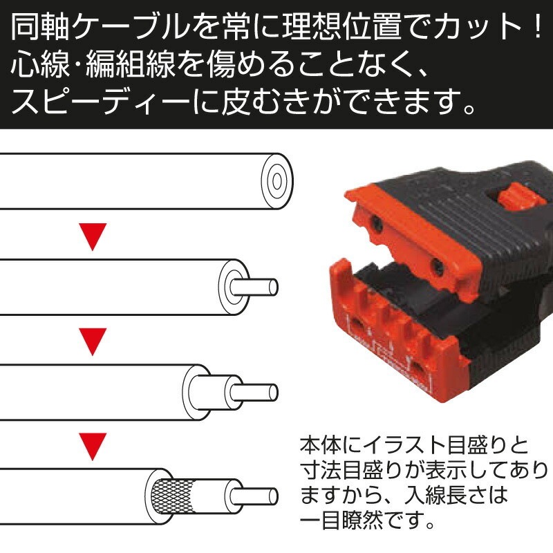 同軸ケーブルを常に理想位置でカッ ト!心線・編組線を傷めることなく、 スピーディーに皮むきができます。