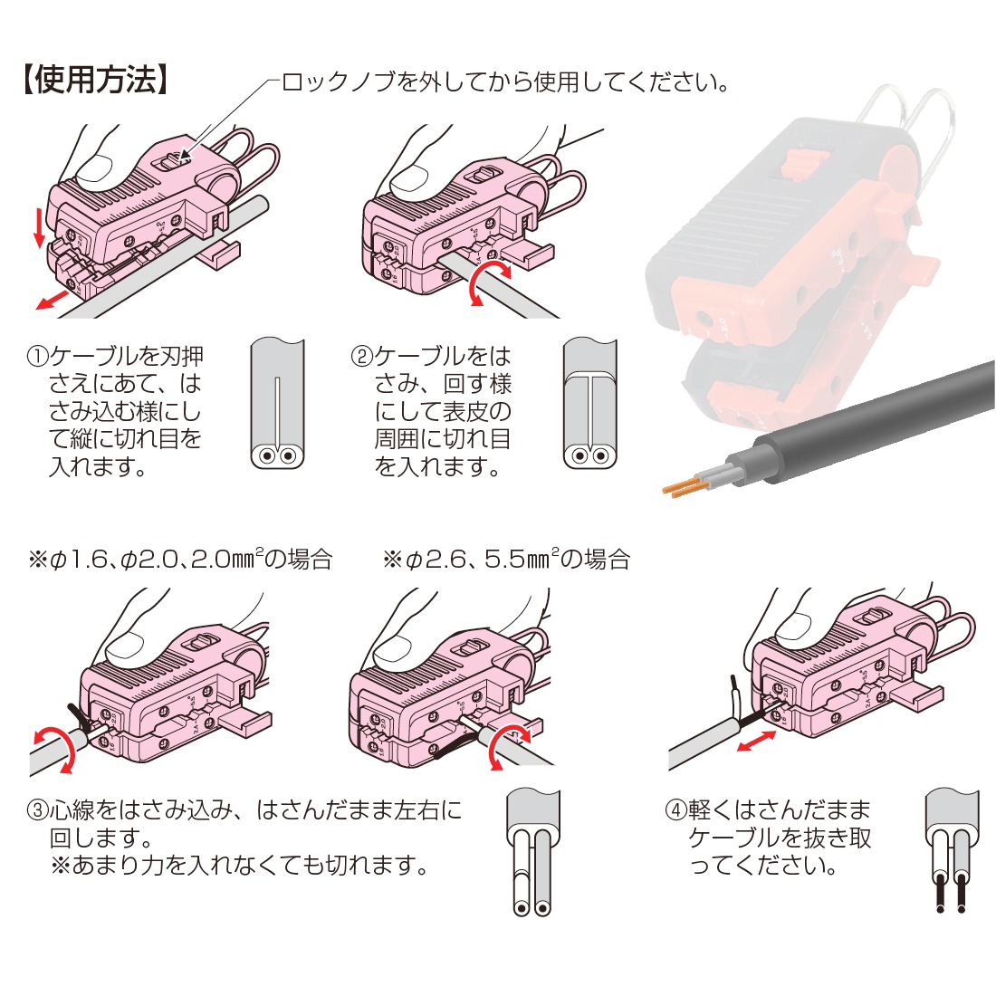 | 適用 | VVFケーブル:2心・3心/Φ1.6~Φ2.6mm2・Φ2.0~5.5mm2 EM-EEFケーブル:4心/Φ1.6~Φ2.0mm2 |