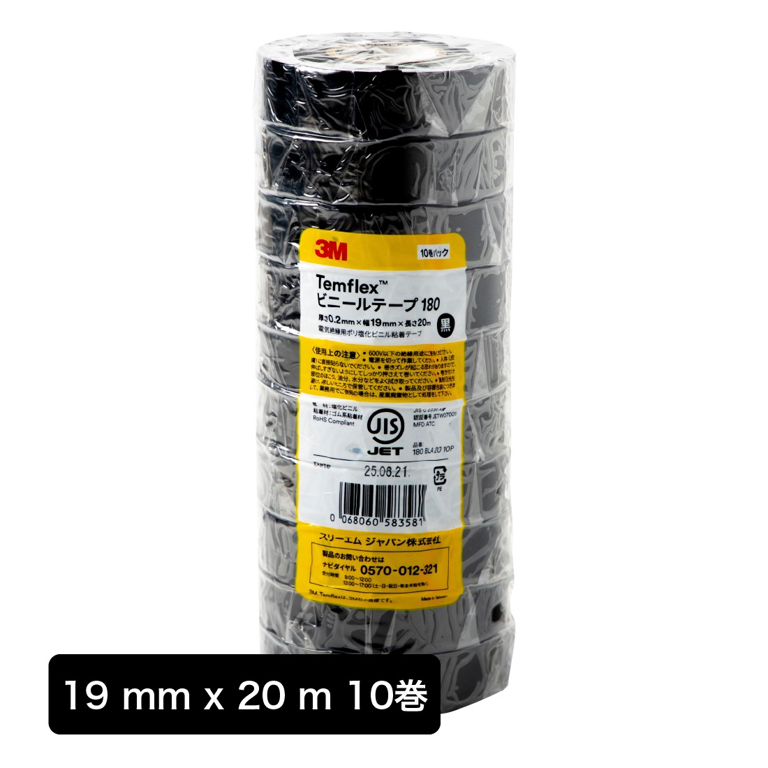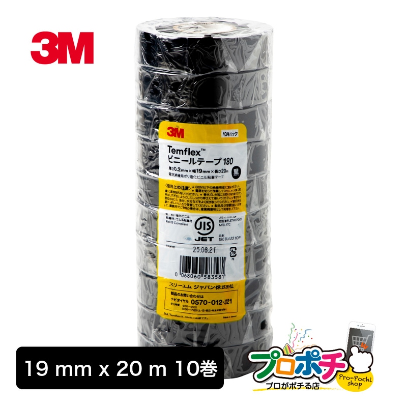 【10巻/1本入】 3M Temflex ビニールテープ 180 BLA 20 電気絶縁用ビニールテープ 19mm×20m