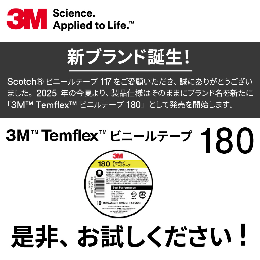 2025年より「Scotch ビニールテープ 117」が「3M Temflex ビニールテープ 180」としてリニューアル。従来の信頼性と品質はそのままに、よりグローバルな統一ブランドとして再登場しました。