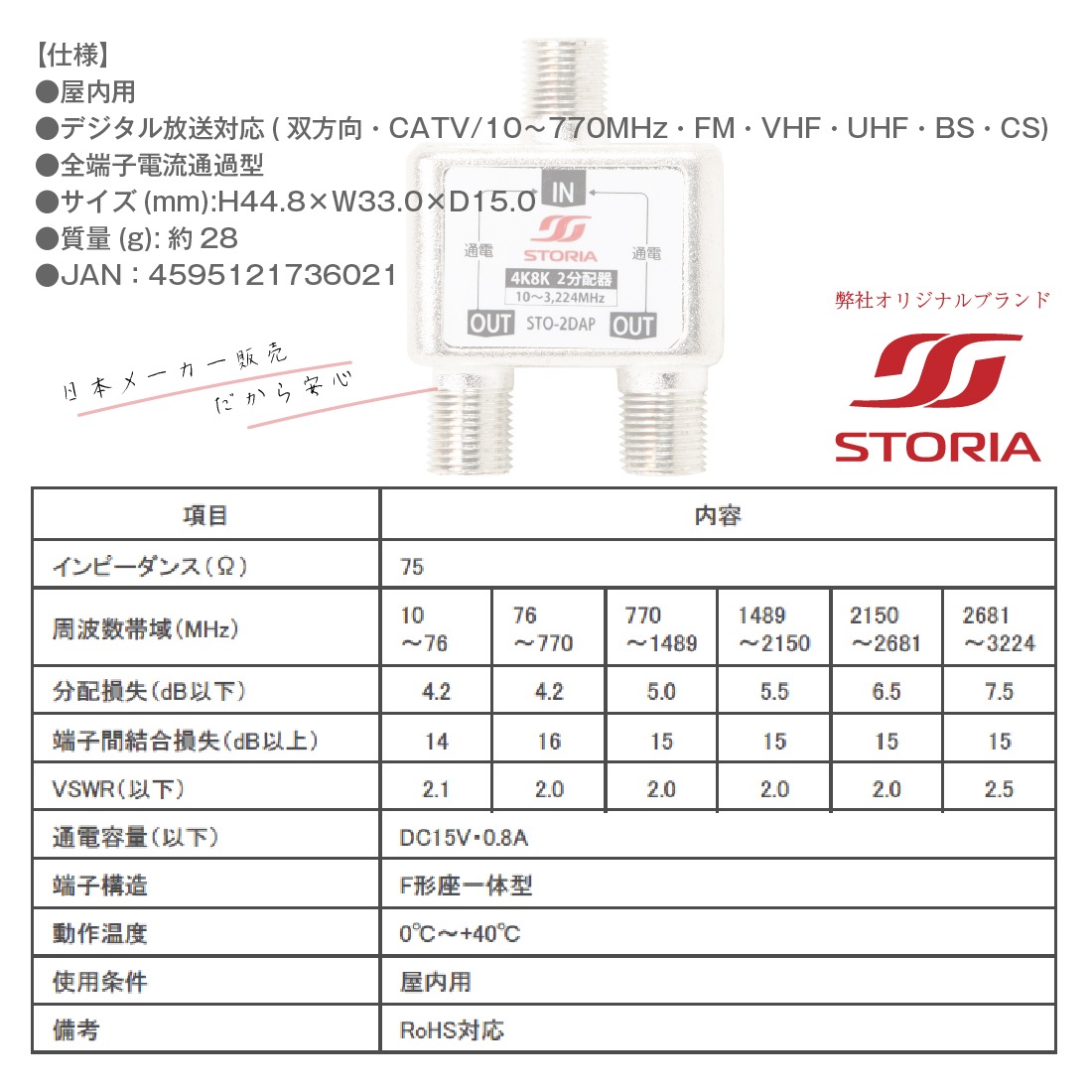 【即配】屋内用 2分配器 全端子通電型 STORIA/ストリア STO-2DAP 4K8K衛星放送(3224MHz)対応