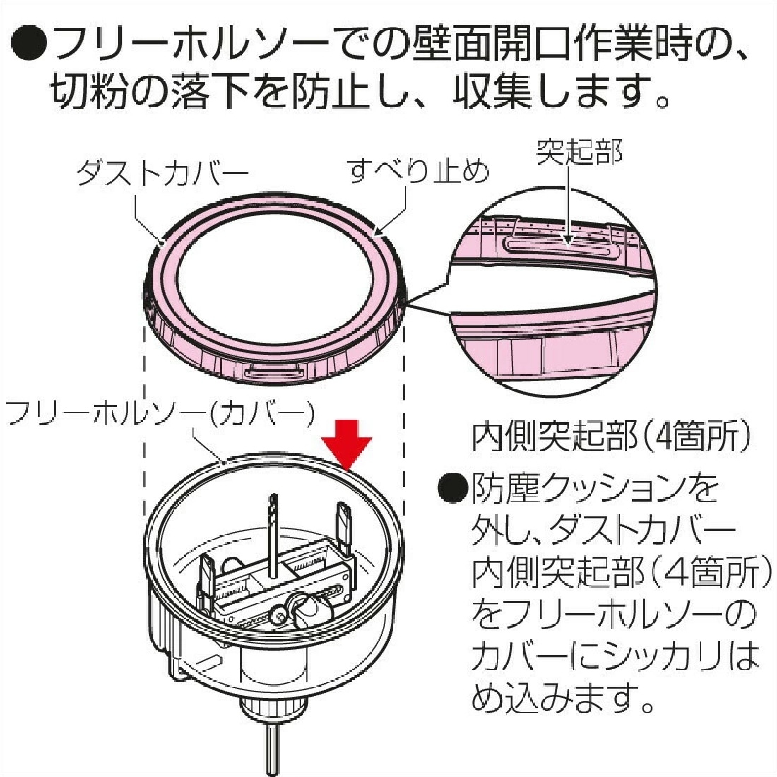 フリーホルソーでの壁面開口作業時の、切粉の落下を防止し、収集します。