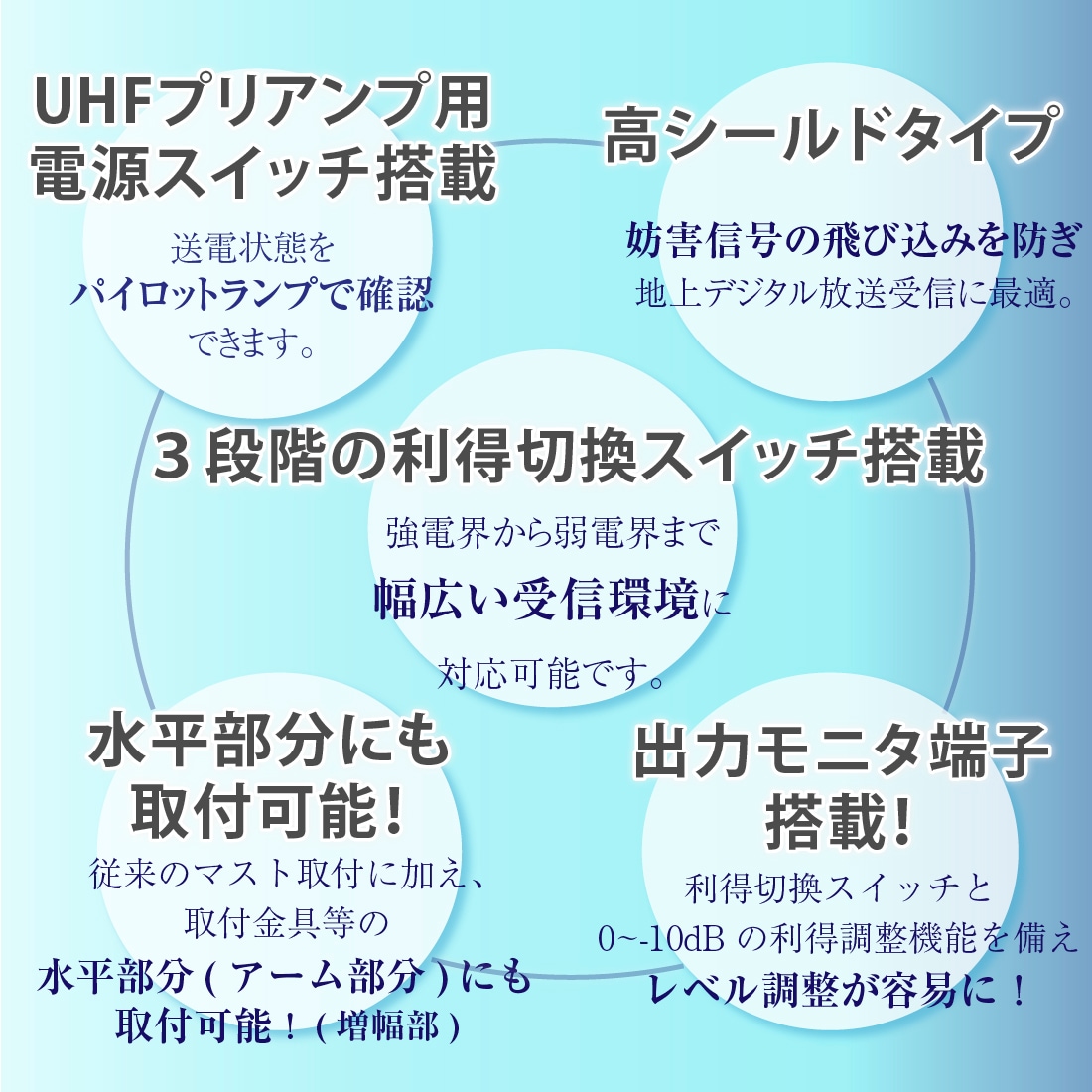 利得切換機能を搭載している為、強電界から弱電界まで幅広い受信環境に対応可能です。