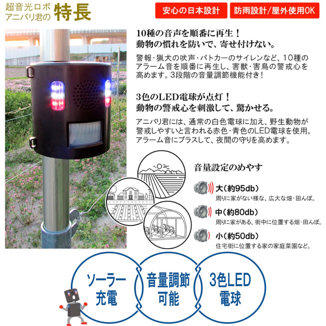 ●警報・猟犬の吠声・パトカーのサイレンなど10種のアラーム音を順番に再生し、害獣・害鳥の警戒心を高めます。