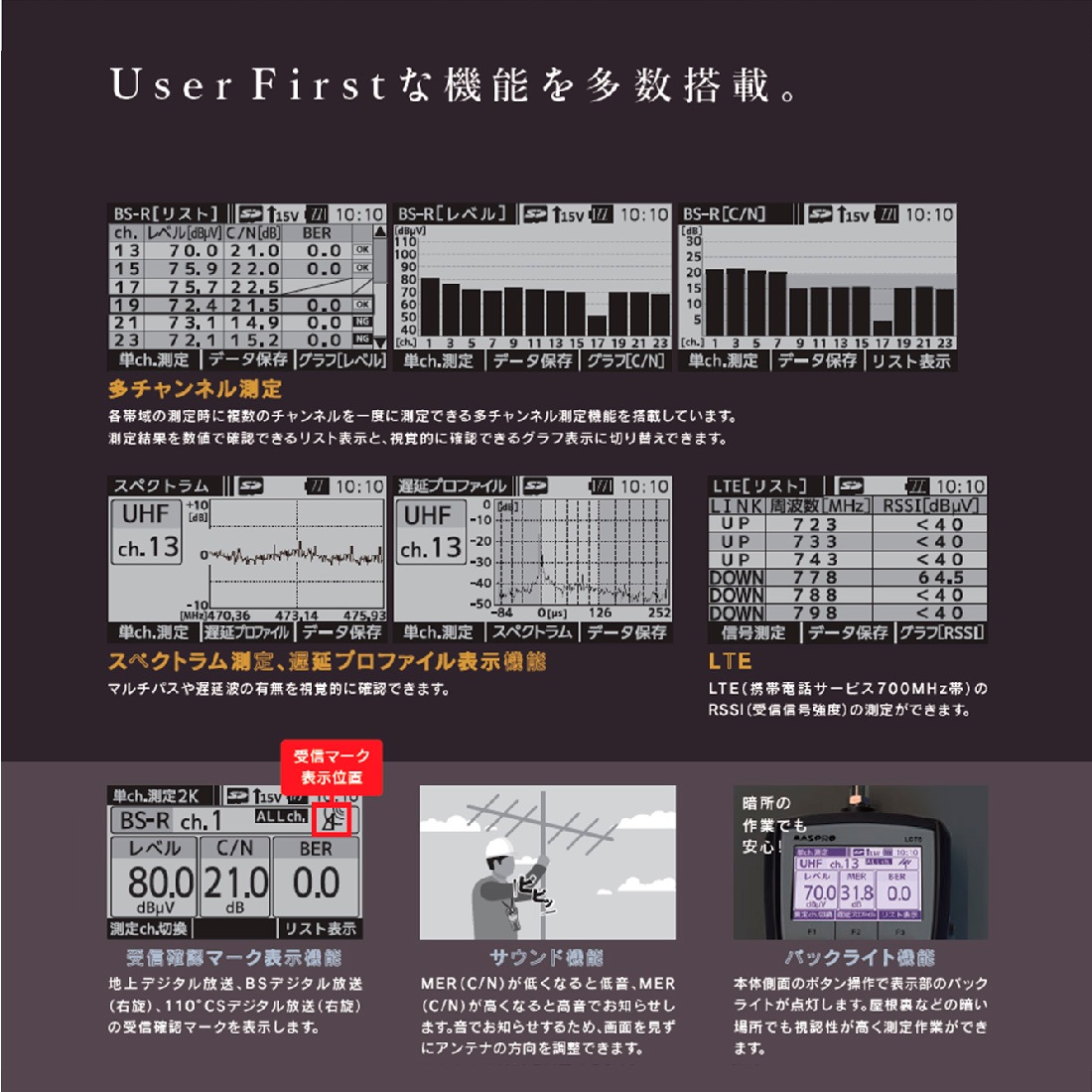 UHF(地上デジタル放送)、BS 右旋・110°CS 右旋放送の受信レベル、信号品質(MER・C/M、BER)に加え、BS 左旋・110°CS 左旋放送の受信レベル、簡易 C/N と、700MHz帯 LTE(携帯電話サービス)の受信レベルを測定できる、ハンディータイプの信号測定器です。