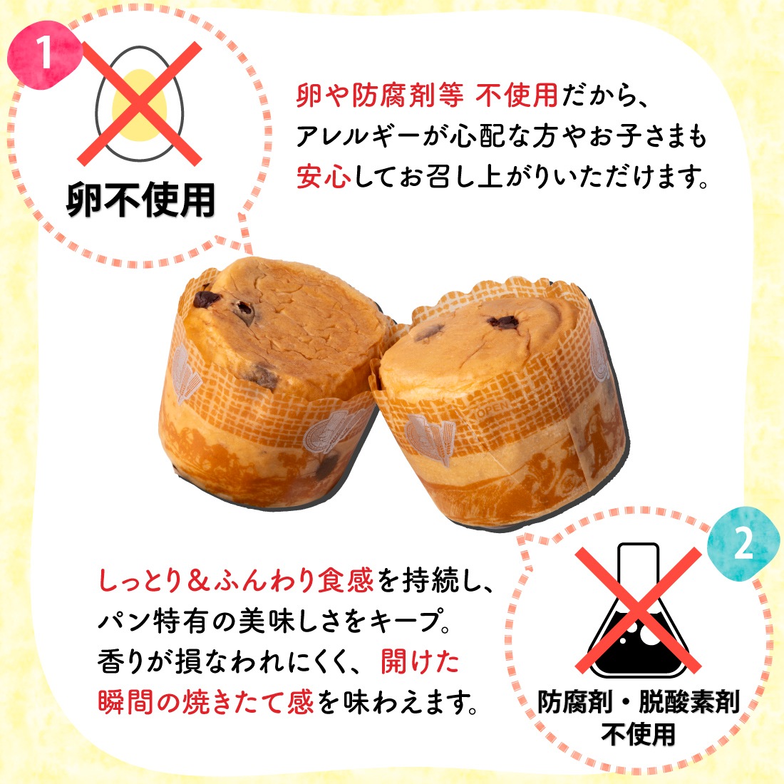 ●卵不使用だから、アレルギーが心配な方やお子さまも安心して食べられます。