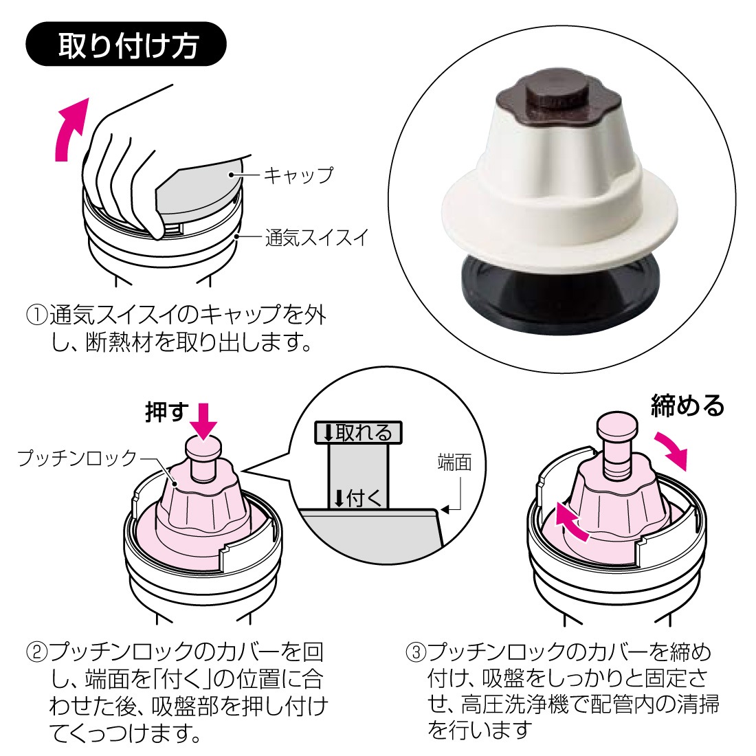 ②プッチンロックのカバーを回し、端面を「付く」の位置に合わせた後、吸盤部を押し付けてくっつけます。