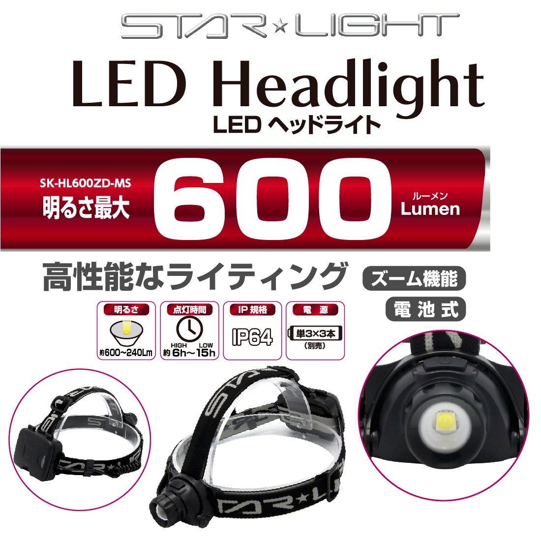 SK-HL600ZD-MS LEDヘッドライト 600lm 乾電池式 ヘッド角度調整 照射モード3パターン 星光商事 / スターライト