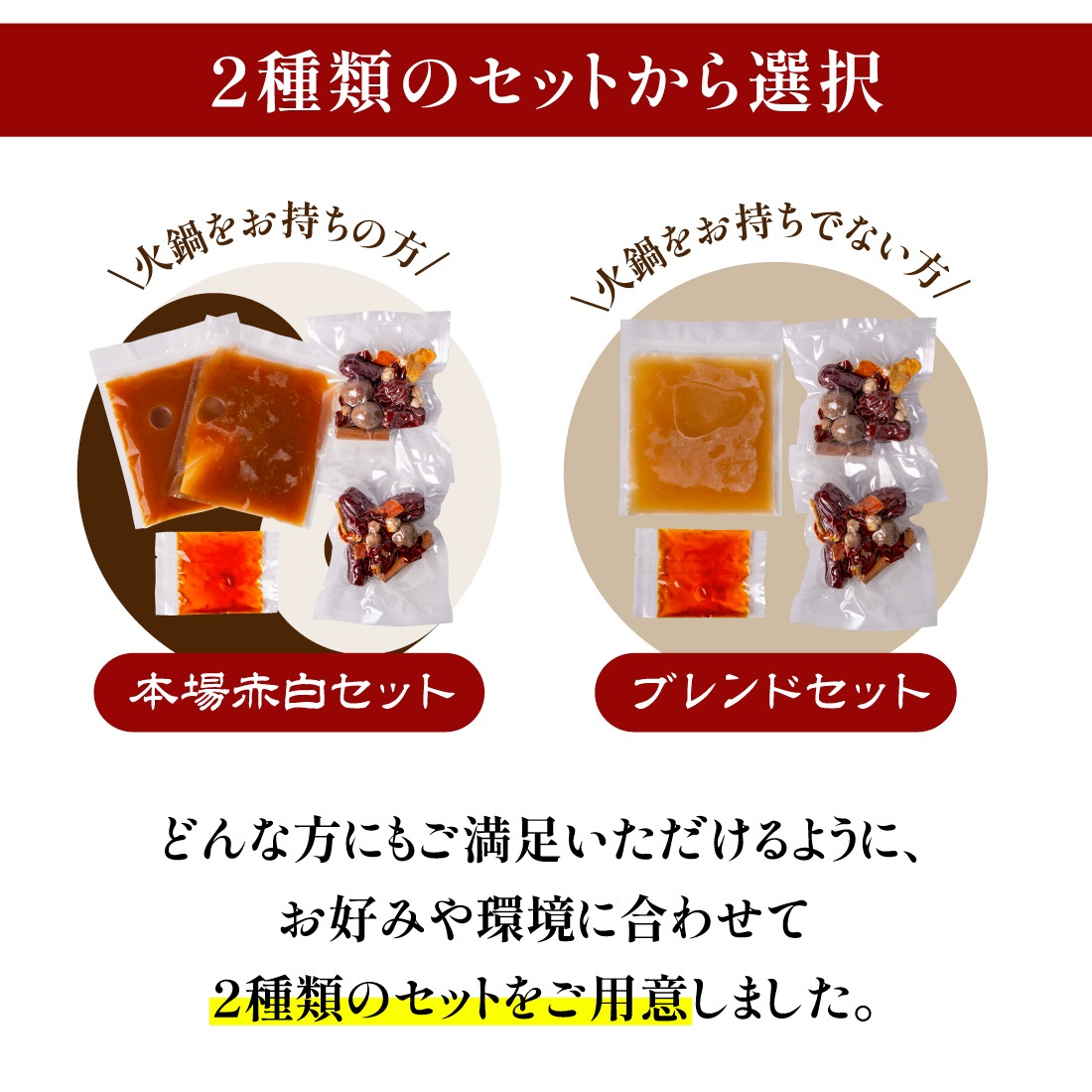 お好みや環境に合わせて、「本場赤白セット」と「ブレンドセット」の2種類をお選びいただけます。