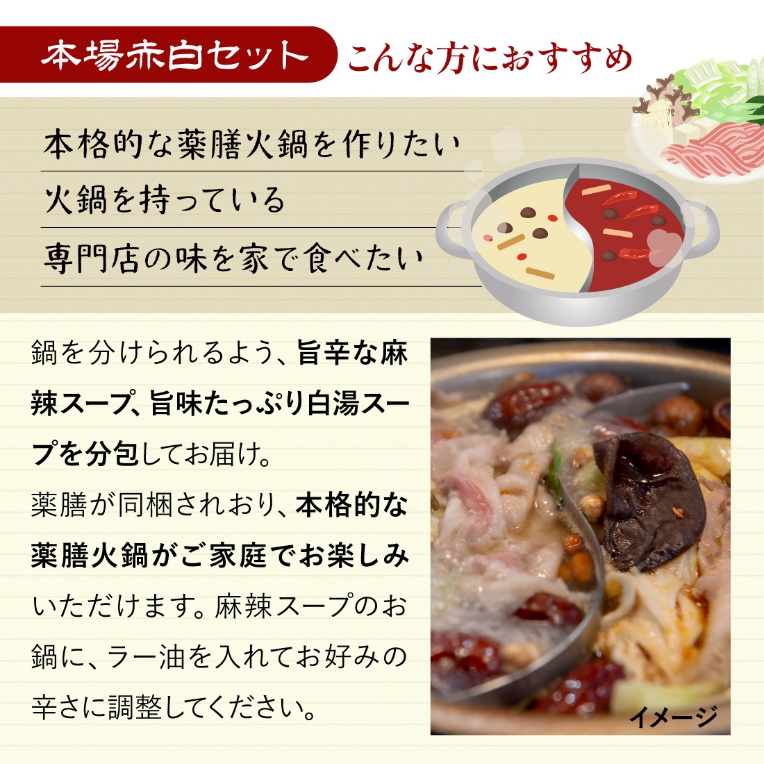 本格的な薬膳火鍋がご家庭でお楽しみいただけます。