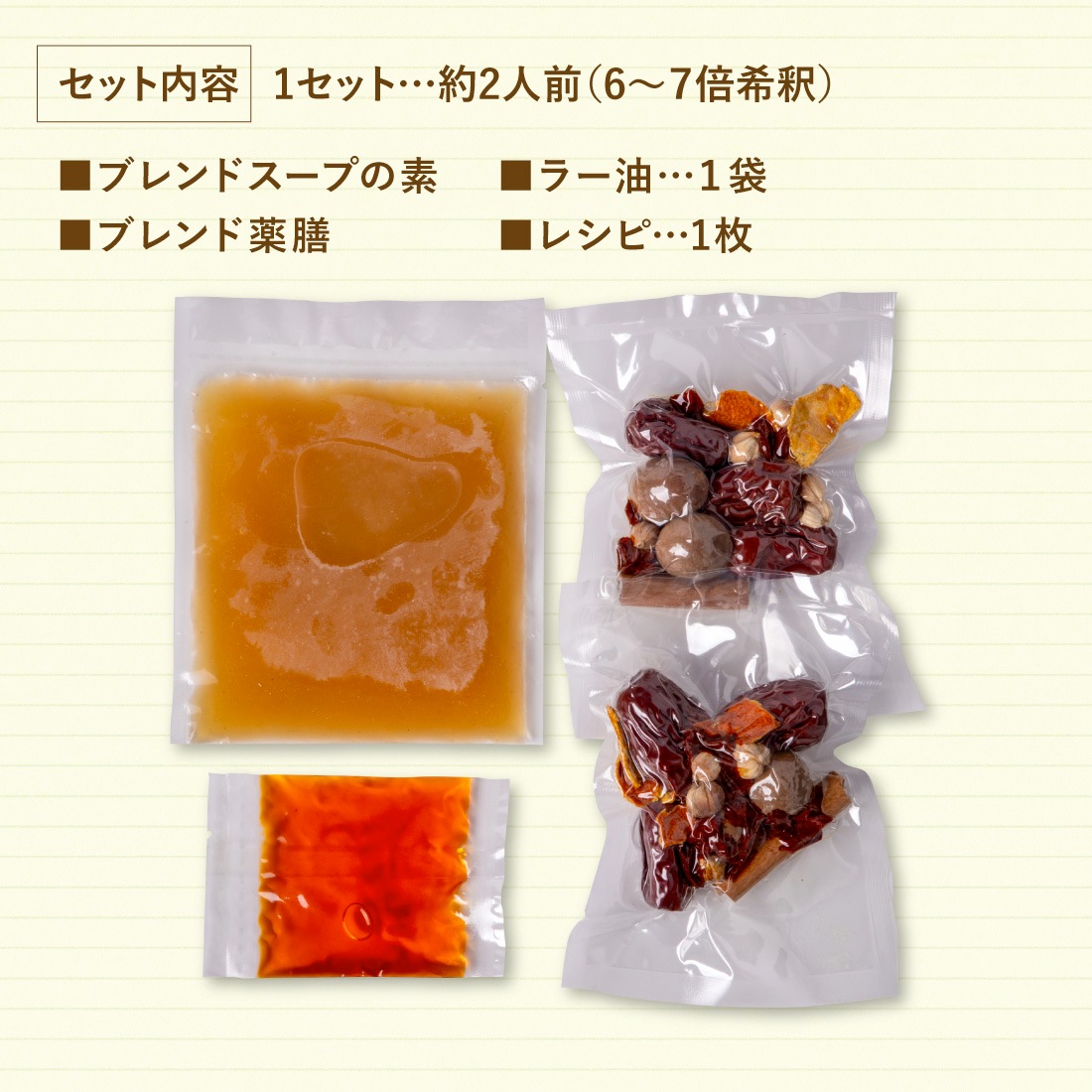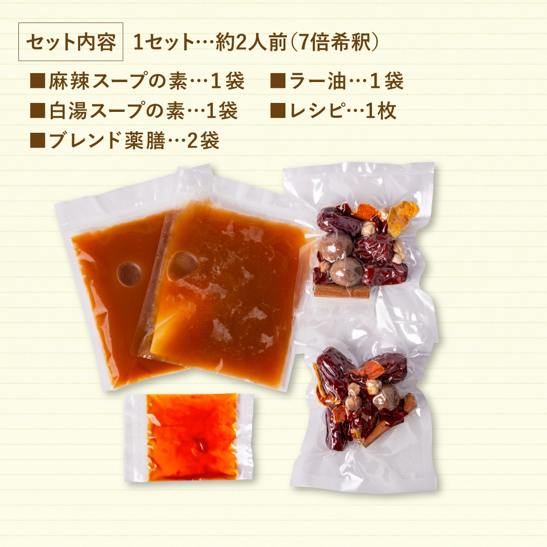 (麻辣、白湯スープのブレンド150ml、6種薬膳2袋、ラー油1袋、レシピ)