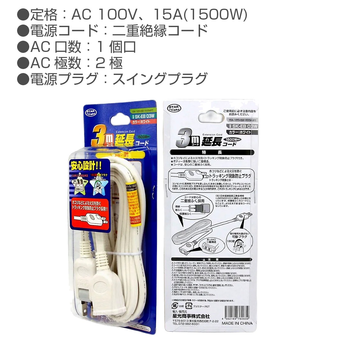 SK-EB03W 延長コード 1個口 コード長 3m 星光商事 / スターライト