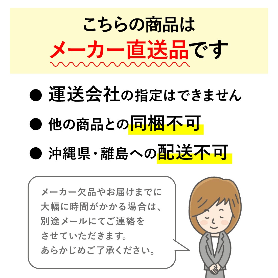 メーカー直送のため、注文確定後のキャンセル、及びお客様都合の返品はお受けできません。